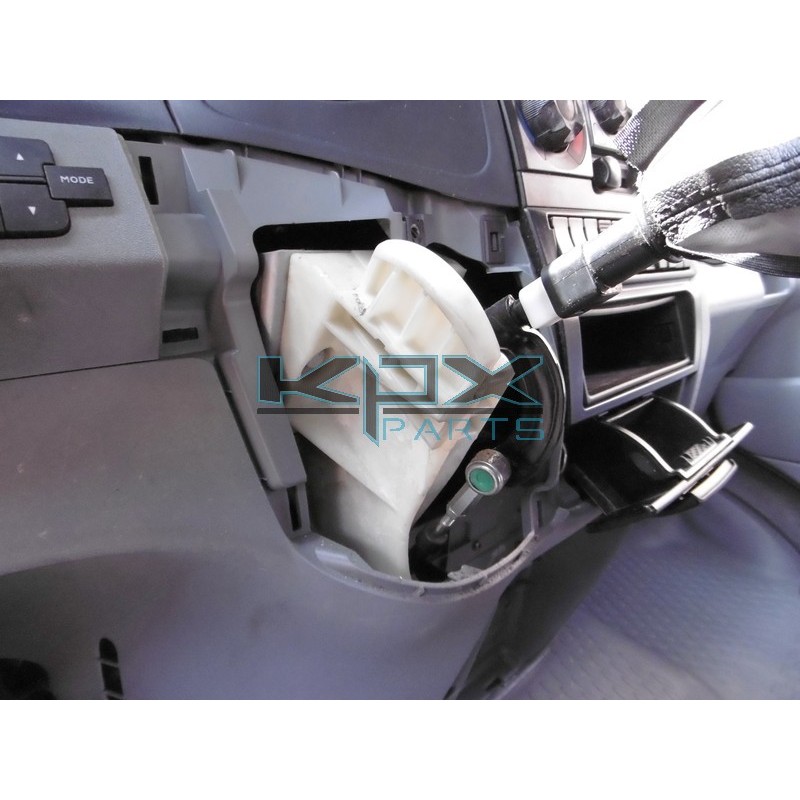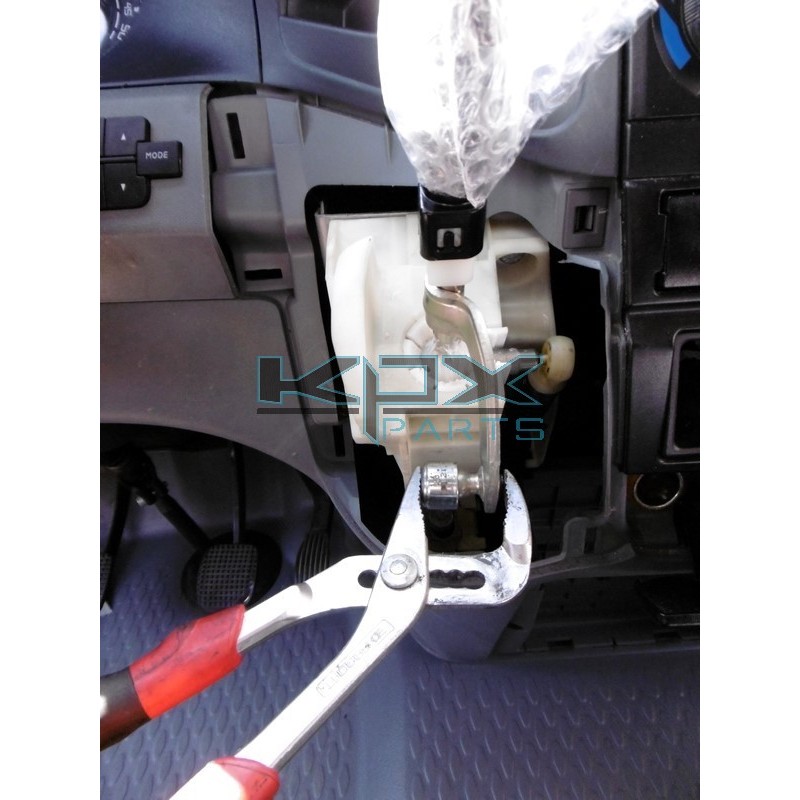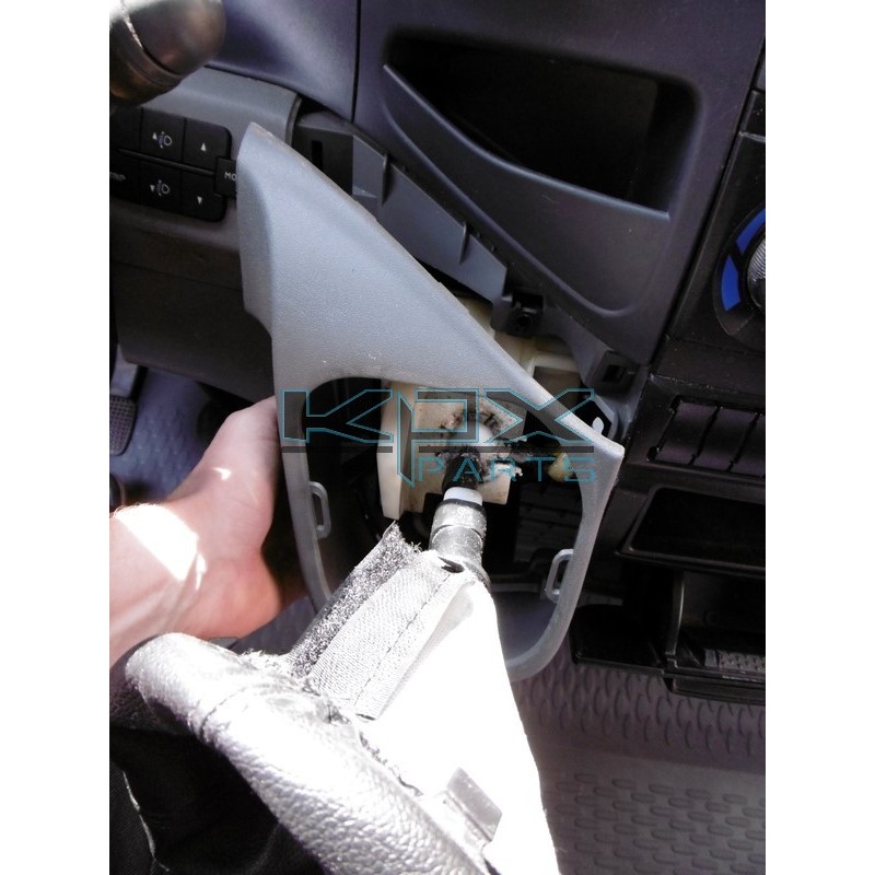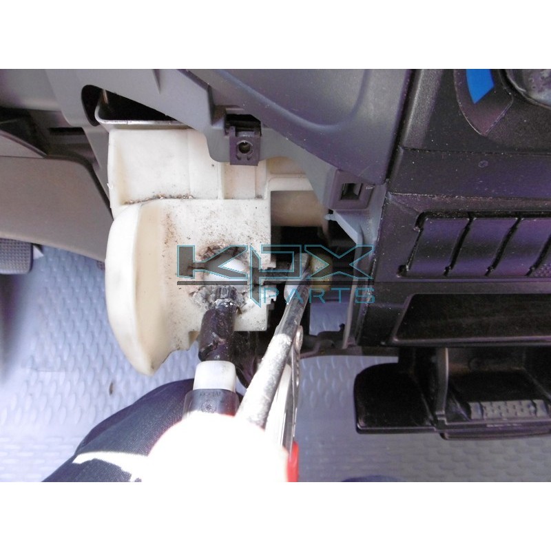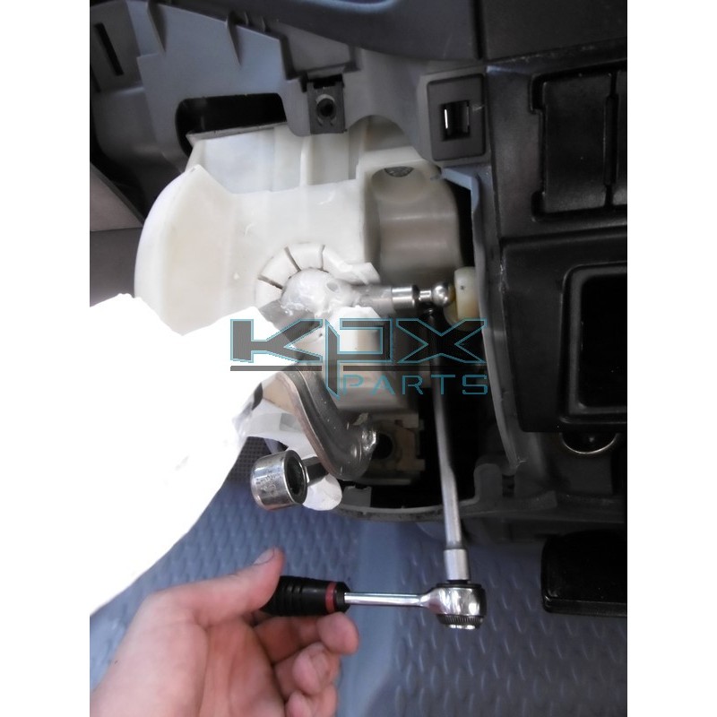 3°) Mit einer kleinen Ratsche, einer Verlängerung und einem Buchse von 12 den Halter vom HEBEL ab. Ich empfehle Ihnen, Papier oder Lappen um das HEBEL zu legen, um zu vermeiden, dass die SCHRAUBE in das Armaturenbrett fallen.